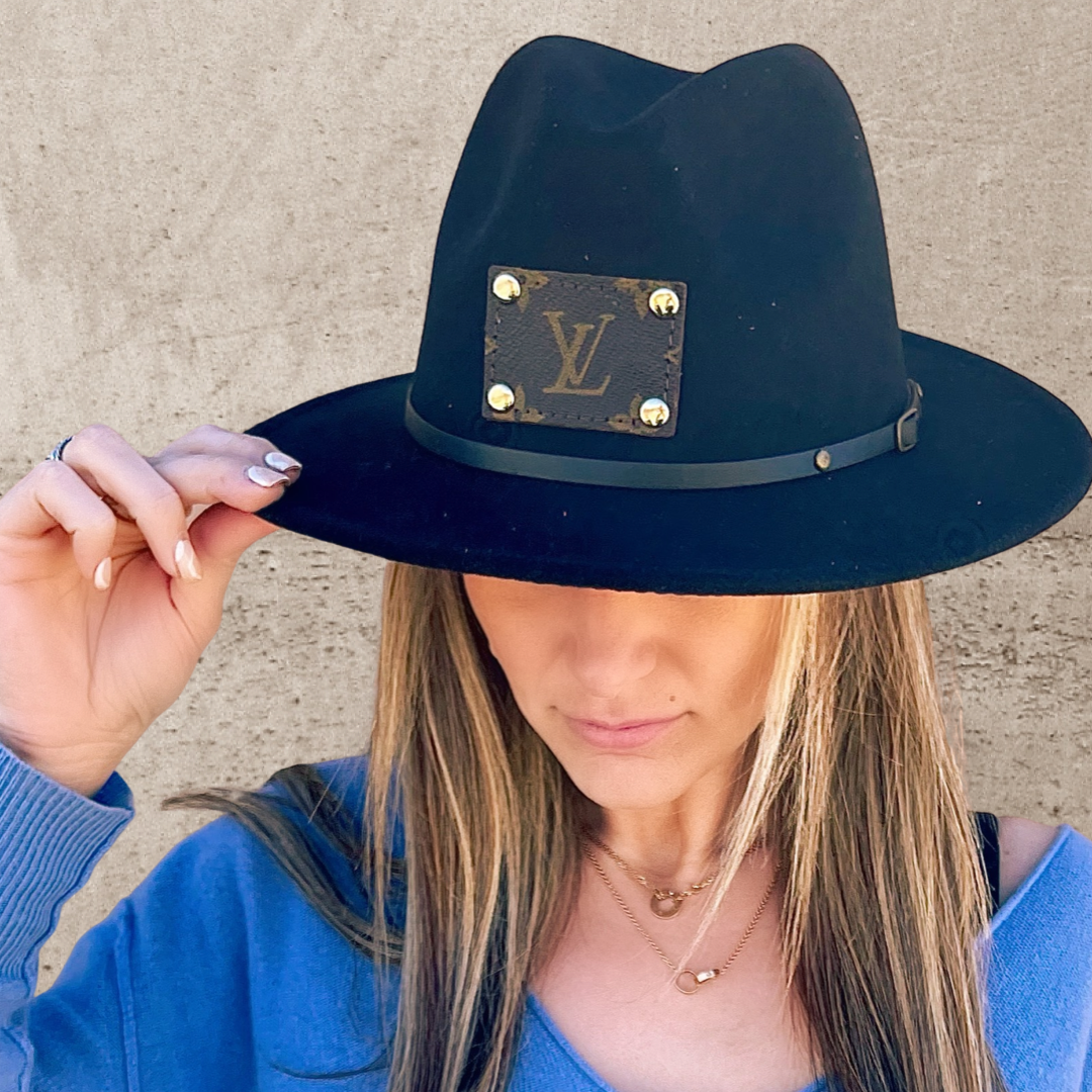 Our Reno upcycled LV hat is a staple for your closet and a must have to dress up any outfit. Re-purposed with a 100% authentic LV stitched patch backed with genuine leather and braded on with solid brass brads.